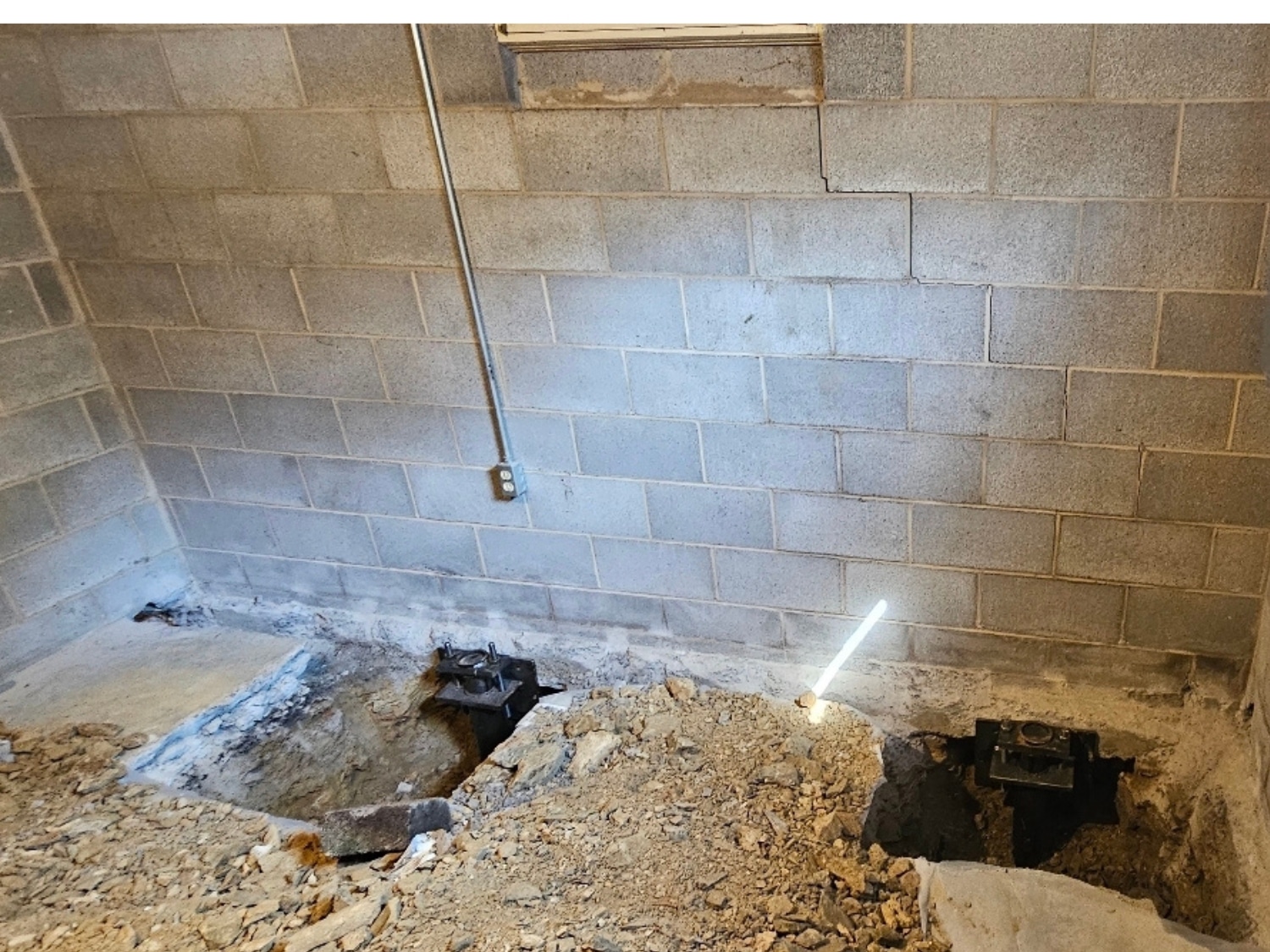 Working according to engineering and manufacturer specifications, we installed seven standard-duty push piers beneath the basement’s footing. Each pier was precisely positioned to bear the load of water-damaged foundation, transferring the weight to stable soil layers below.